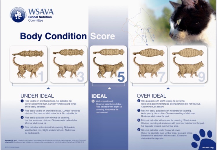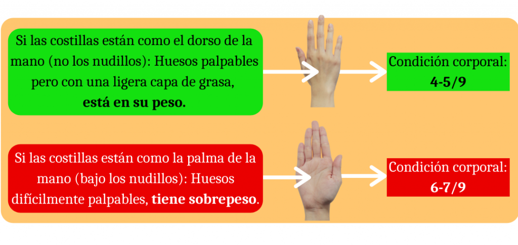 Estas son solo parte de todas las patologías que pueden aparecer. Otras muy conocidas y relevantes serían la diabetes o los tumores mamarios. Entonces, ¿cómo puedo saber si mi animal está obeso? En la clínica veterinaria se hace uso de las puntuaciones de condición corporal, las cuales pueden estar sobre 5 o 9 y donde el peso ideal está situado en el valor intermedio, es decir 3 y 5 respectivamente. Pese a tener unas escalas, no deja de ser una valoración con una cierta subjetividad. Sin embargo, es bastante precisa.
